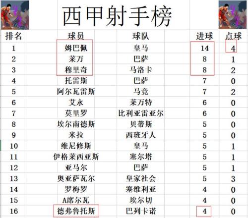 射手榜方面,前十没有变化,姆巴佩14球高居榜首,莱万和穆里奇8球并列第2,托雷斯,阿尔瓦雷斯7球并列第4。德弗鲁托斯今天未能进球,还是差1球才能追上维尼修斯,亚马尔等人挤入前十。